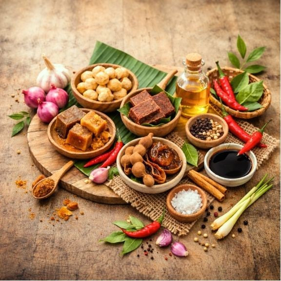 Essential Indonesian pantry ingredients for everyday cooking, including candlenut (kemiri), shrimp paste...